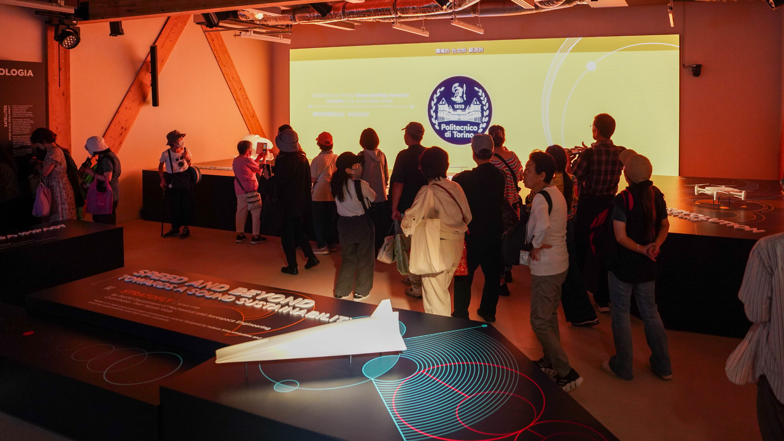 The exhibition, entitled “Flying: Where Dreams Meet Technology”, will take visitors on a journey through prototypes, videos, and stories, exploring the frontiers of Politecnico aerospace research: from urban drones to stratospheric aircraft, to satellites and their applications on Earth. Research projects from various departments and student teams contributed to the exhibition, which is organized into a narrative comprising five chapters. These chapters guide visitors from the latest developments in urban and local transportation to intercontinental flights and space travel, always with an emphasis on sustainability. The exhibition design, curated by DAD, has arranged the multifunctional space of the pavilion to ensure that the exhibition and talks can coexist and complement one another.