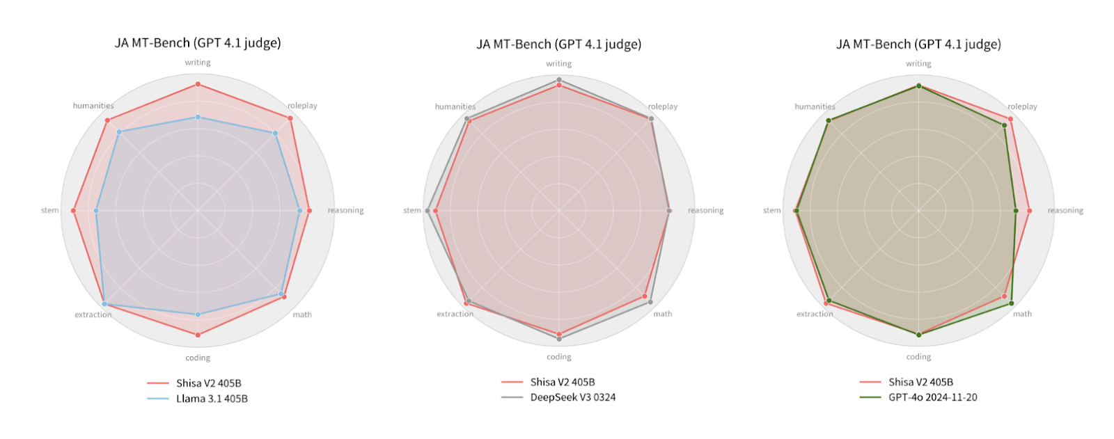 According to the team’s evaluation results, Shisa V2-405B demonstrates capabilities comparable to OpenAI’s GPT-4o and China’s DeepSeek-V3 across multiple Japanese language tasks—including instruction understanding, role-playing conversations, Japanese-English translation, semantic reasoning, and text generation.
