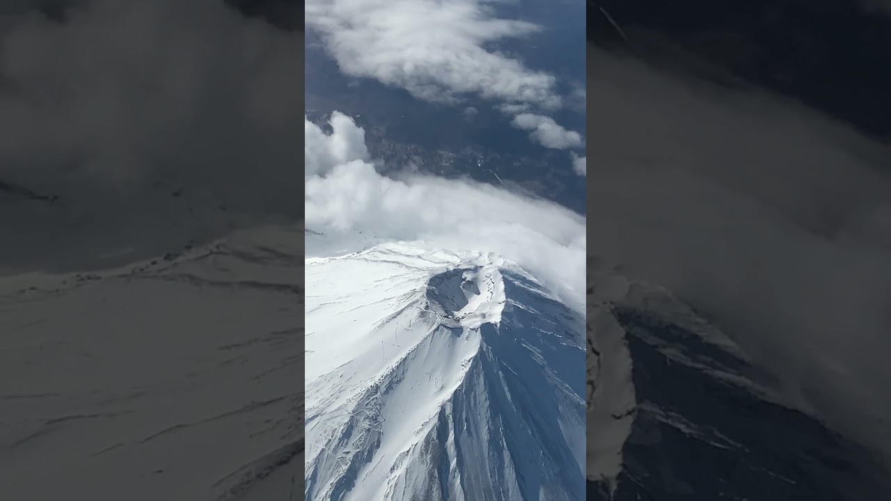 日本一の山、雪におおわれた富士山、山頂を飛行機で通過。