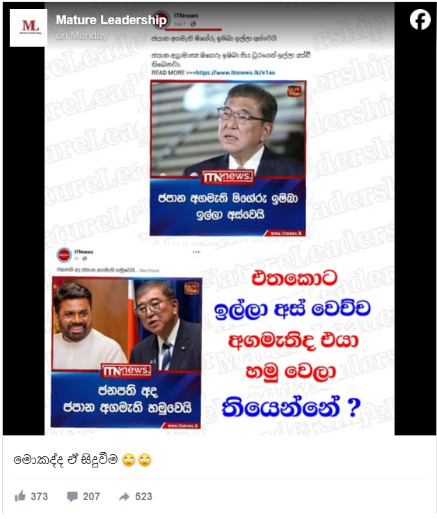 These posts indicated that the Japanese Prime Minister had already resigned on September 7. The Sri Lanka President met the same Japanese Prime Minister Shigeru Ishiba, on the 29th of September, who had already resigned.