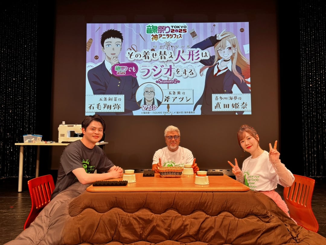 The Gojou Family: Ishige Shouya (Gojou Wakana), Suguta Hina (Kitagawa Marin) and Ono Atsushi (Gojou Kaoru) at the "That Cosplay Doll Does Radio at the Onsen Festival Too" public recording event
