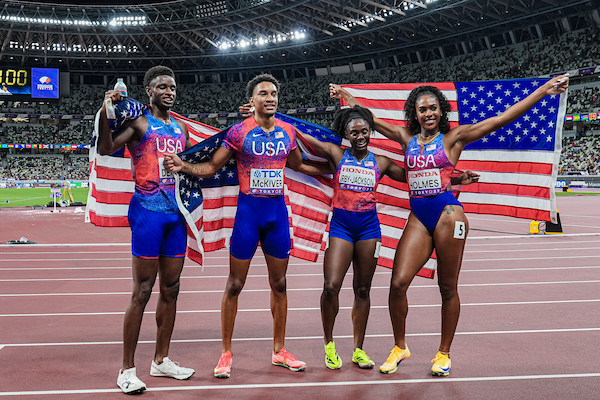 The US gold medal winning team in the Mixed 4×4, photo by World Athletics, Tokyo WCH 2025