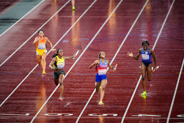 The USA Women’s team took gold in the 4x100m relay, despite intense rain and tough competition. The team consisted of Melissa Jefferson-Wooden (gold in the 100m and 200m), Twanisha Terry, Kayla White, and Sha’Carri Richardson, who ran 41.75, with Jamaica taking silver in 41.79. Germany won the bronze in the 4x100m relay in 41.87 seconds. The race was incredibly close and exciting!