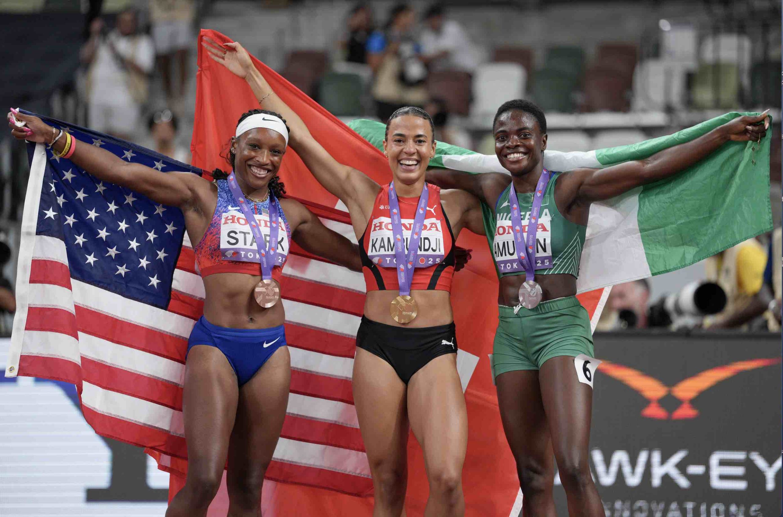 Grace Stark, silver, Ditaji Kambundji, gold, Tobi Amusan, bronze, photo by Getty Images for World Athletics
