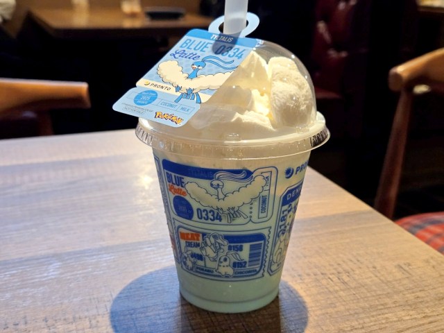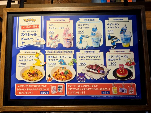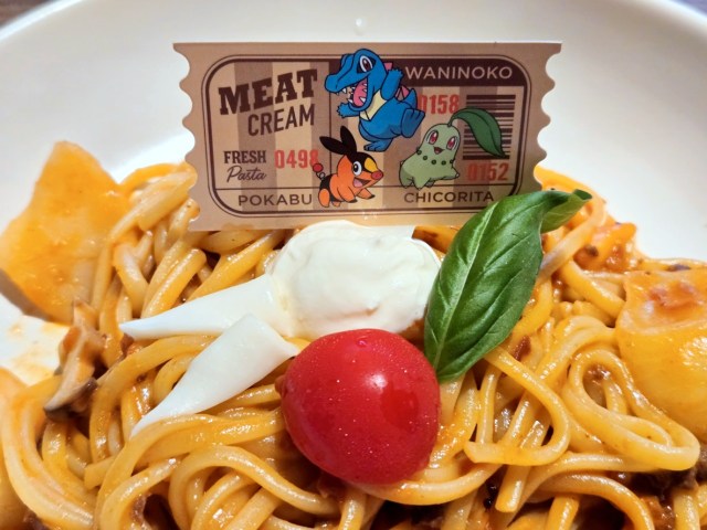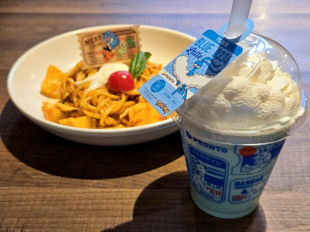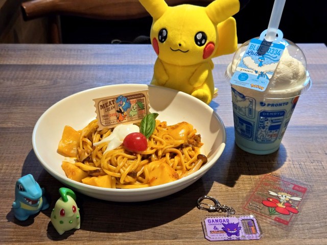 Ordering from the limited-edition menu will net you some original novelties, making it tempting to eat ’em all, but when we visited we decided to exercise restraint, ordering the Altaria Coconut Blue Latte (990 yen [US$6.73]) and the Chikorita, Tepig, and Totodile’s Friendly Meat Cream Fresh Pasta (1,870 yen).