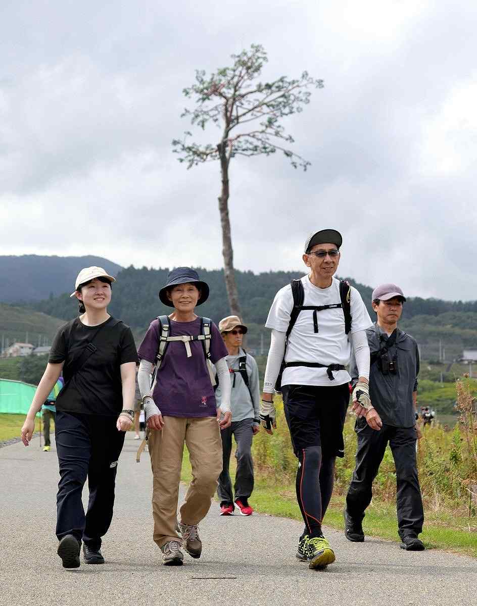 The “kiseki no ipponmatsu,” or miracle pine tree, is seen behind participants in the Michinoku Coastal Trail in Rikuzantakata, Iwate Prefecture, on Sunday.