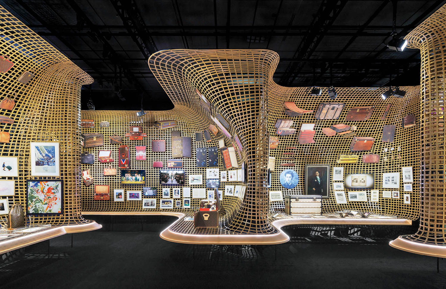 Not that France had been forgotten along the way: “Workshop” reproduced elements from the Asnières atelier where Vuitton trunks are made—green-painted steelwork, a sawtooth roofline, wall-mounted tools—along with hefty solid-beech workbenches where artisans gave live demonstrations of their craft. And “Atelier Rarex” reinterpreted the mansard roof of Maison Vendôme, the company’s Paris flagship, transforming its two tiers of windows into 20 stainless-steel display niches, each containing an haute-couture creation. Mirror-clad end walls expanded the installation, turning it into an infinite Haussmannian roofscape.