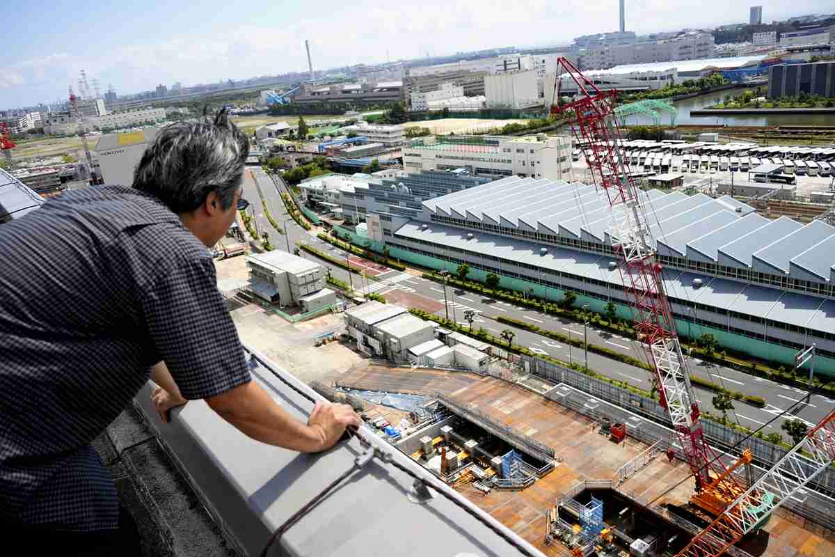 Yuki Mizoi watches the construction of a data center directly next to his condominium unit in Koto Ward, Tokyo.
