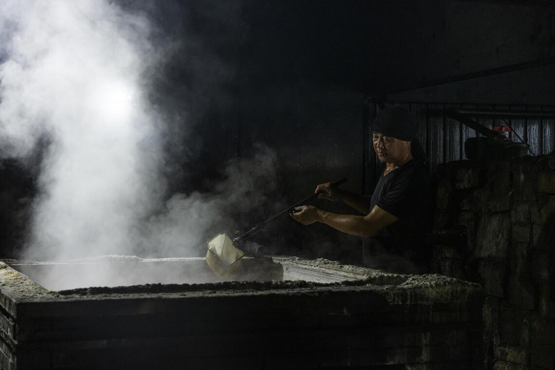 It is like entering a salt sauna, where Hyakusho-an’s president Yuzen Inoue gently stirs and mixes the water drawn from the Sea of Japan into tanks that are heated up via woodfire.