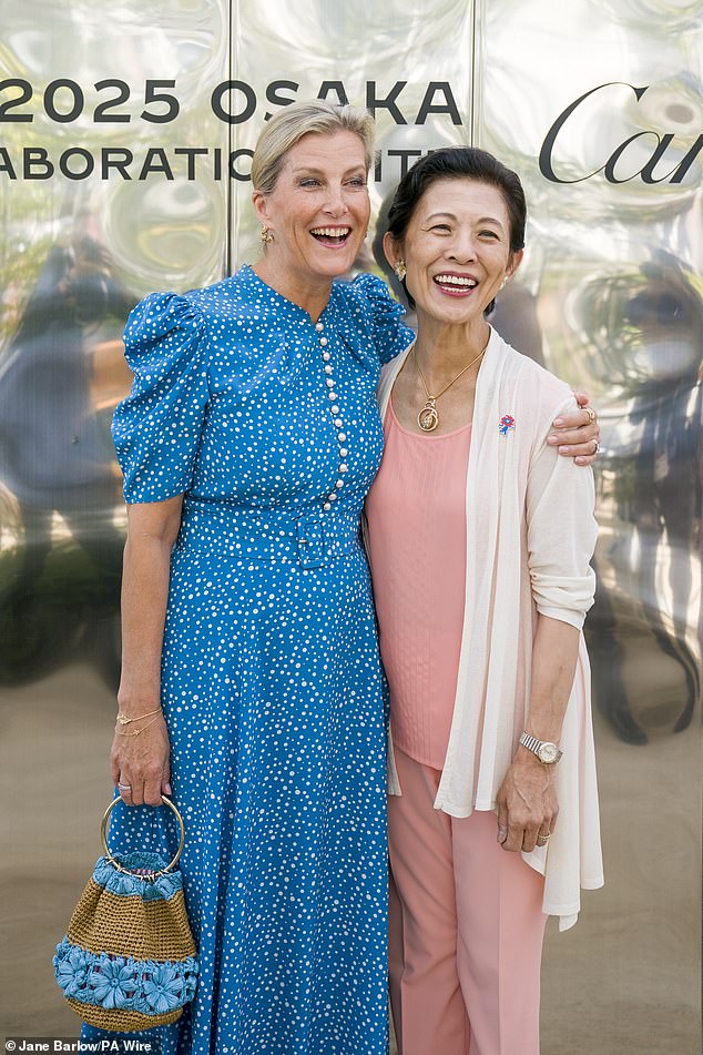 Sophie, 60, appeared in high spirits as she met with the Japanese royal at the Women’s Pavilion at the Osaka Expo (both pictured)