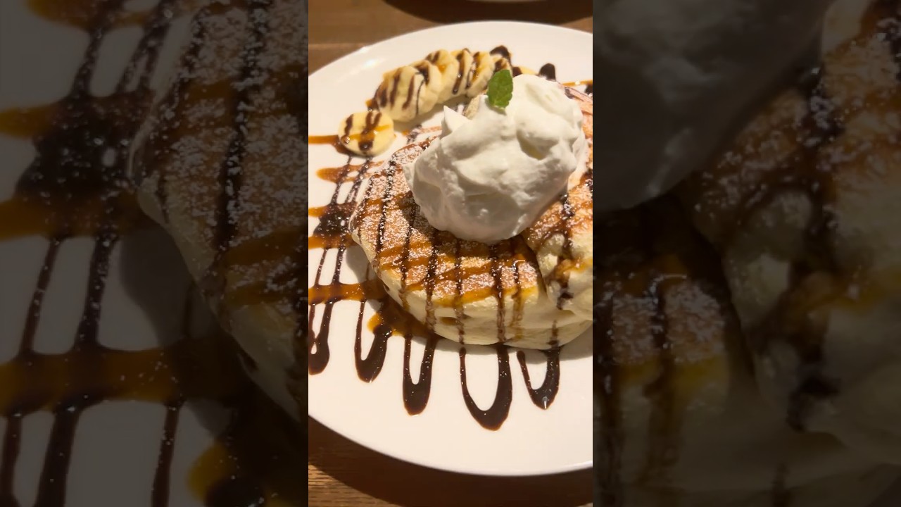This café is especially popular for its fluffy Japanese souffle, with options ranging from simple ones to those topped with ice cream or mixed berries and so on. This time, I chose one with chocolate sauce and bananas, and another with spam and scrambled eggs.