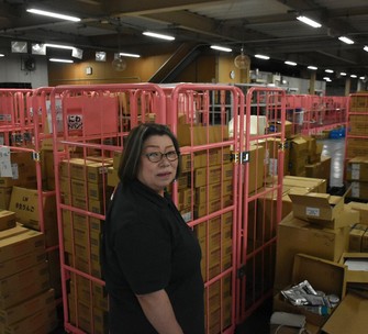 Kodomo no Ibasho Support Osaka’s executive director Hiromi Yokota is seen standing by boxes of food items donated by companies and others, in Osaka’s Nishinari Ward. Checking the expiration dates is an essential process. (Mainichi/Kentaro Nagaoka)