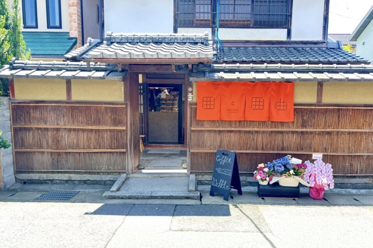 Kakoto Ima (Ukyo-ku, Kyoto City, Kyoto Prefecture), a waffle specialty store operated by the popular bakery-cafe Bread and Espresso, opened in Arashiyama, a renovated two-story machiya (traditional Kyoto townhouse) with an orange curtain on the first floor and a wooden floor on the second floor. The first floor has table seating, while the second floor is a wooden floor, creating a relaxed atmosphere that makes you want to stay longer.
