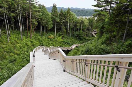A boardwalk and series of steps leads to an observation deck that commands stunning views of the hot spring resort and the mountains lining the border of Ishikawa and Fukui prefectures. Artificial mist is used to create an atmospheric “sea of clouds.”