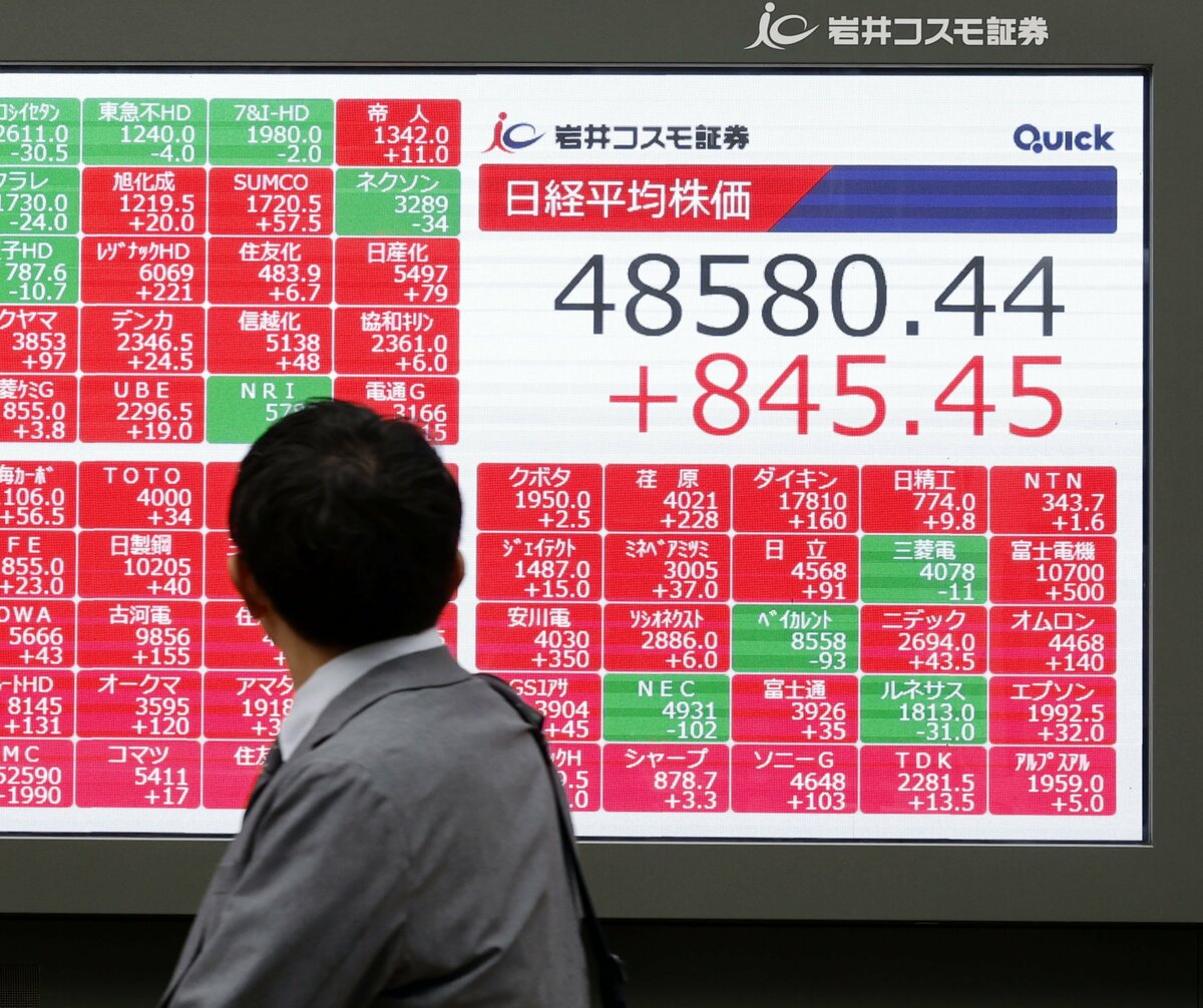 The 225-issue Nikkei Stock Average rose 845.45 points, or 1.77 percent, from Wednesday to close at 48,580.44, finishing above the 48,000 line for the first time. The broader Topix index gained 22.11 points, or 0.68 percent, to 3,257.77, ending at a record high for a fourth straight day.
