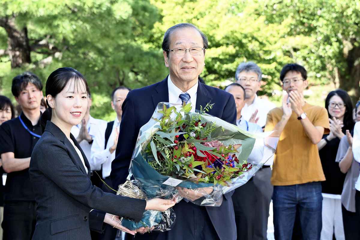 Wearing a navy-blue tie and jacket, he received a bouquet from a university employee under clear autumn skies.