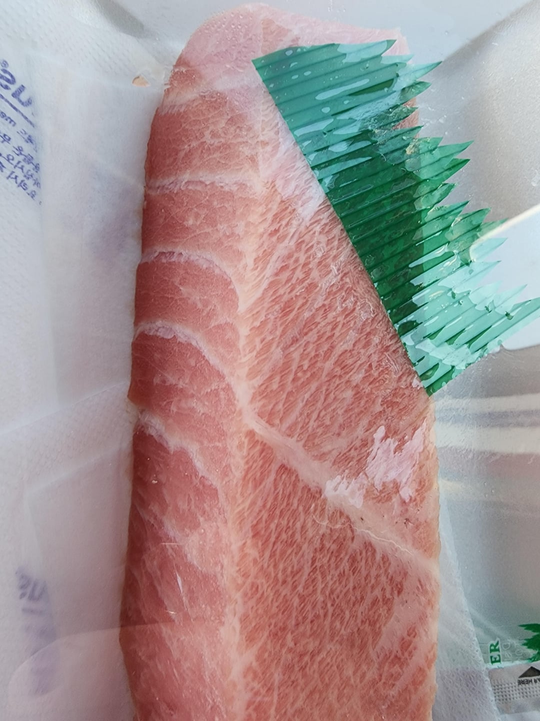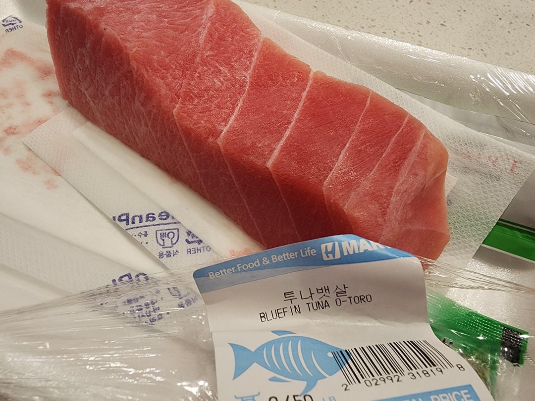 I, tonight, bought some Otoro Tuna tonight in hopes of making some Sashimi or Sushi tonight at home. I have a sharp knife, and I'm pretty familiar with eating Otoro, Chutoro and Akami. The issue I'm having is, the texture is rather odd. It's almost… Crunchy? I've tried slicing against the grain, and then because I'm paranoid and questioned if I knew what "against the grain" meant, I tried slicing the other way. Both ways were…crunchy. I'm not sure what I'm doing wrong. I know I loved Otoro nigiri in Japan 9/10 times, but the flavor profile of this crunchy slab of tuna is almost tomato-y. It doesn't taste spoiled, or wrong, just… Different?