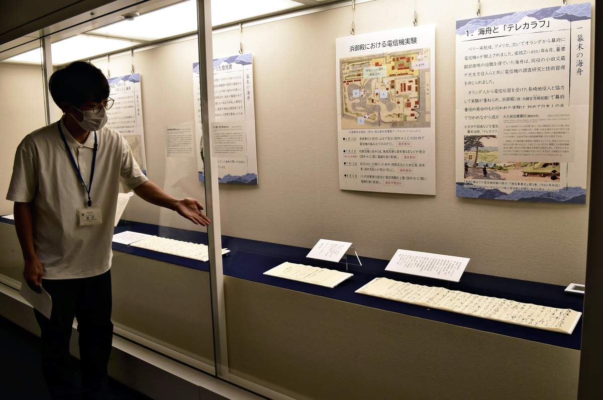 A display introducing Katsu Kaishu’s involvement in telegraph experiments at the Ota City Katsu Kaishu Memorial Museum in Tokyo on Sept. 17
