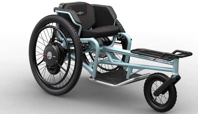 The NACTUS VS TRE-X is a three-wheeled electric wheelchair concept model equipped with the JWX-2 electric power-assist unit. Its striking 26-inch off-road mountain bike tires deliver excellent performance, while the stability unique to a three-wheeled design ensures comfortable travel even across rough terrain and unpaved paths where conventional wheelchairs often struggle.