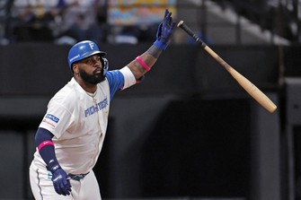 Nippon Ham Fighters outfielder Franmil Reyes hits a go-ahead two-RBI single in the eighth inning of Game 2 of their first-stage Pacific League Climax Series against the Orix Buffaloes at Es Con Field Hokkaido in Kitahiroshima, Japan, on Oct. 12, 2025. (Kyodo)