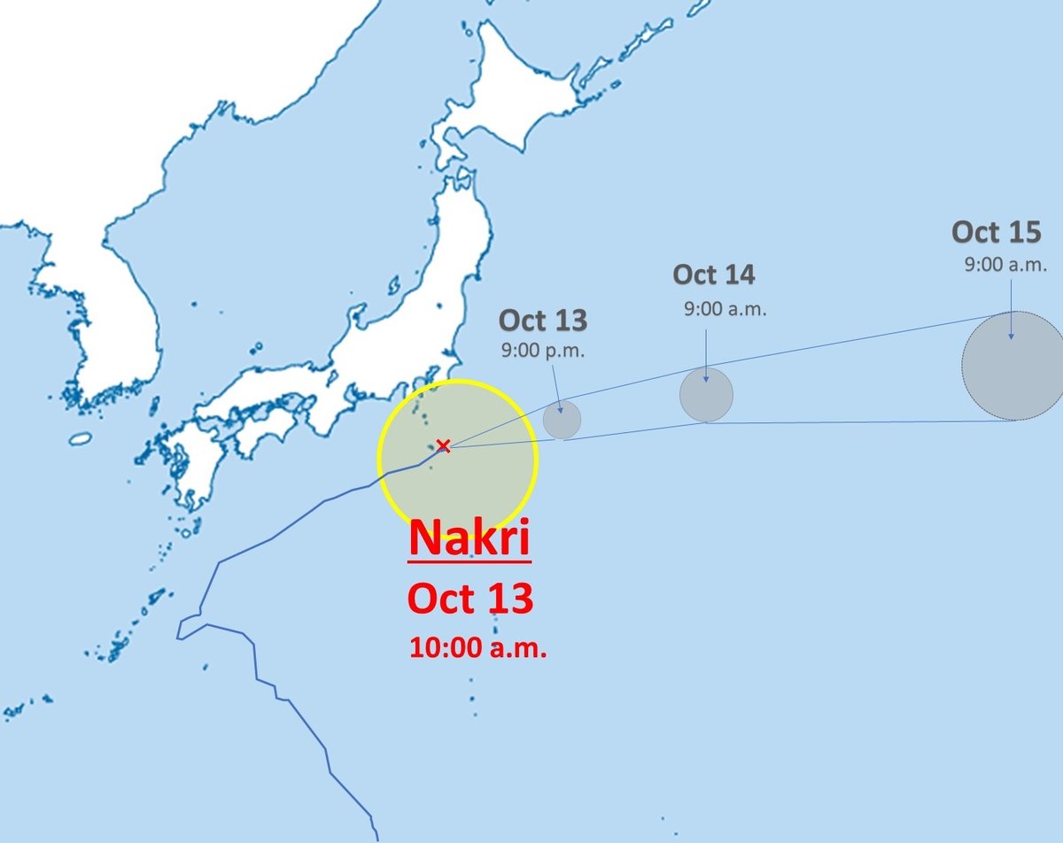 Powerful Typhoon Nakri, or Typhoon No. 23, was moving east-northeast at about 35 kph over the sea east-southeast of Hachijojima Island, Tokyo, accompanied by storm-force winds as of 9 a.m. on Monday.