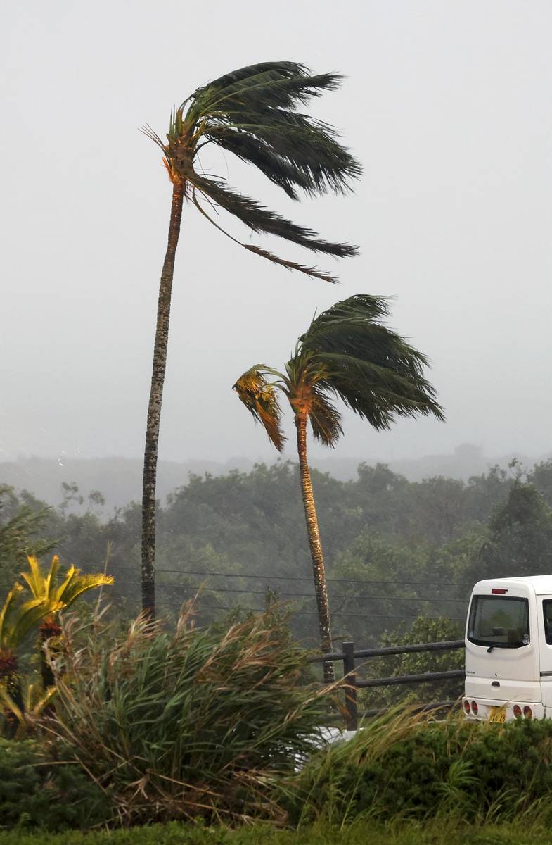 Strong winds blow against the landscape of Hachijojima Island, Tokyo, at 6:44 a.m. on Monday.