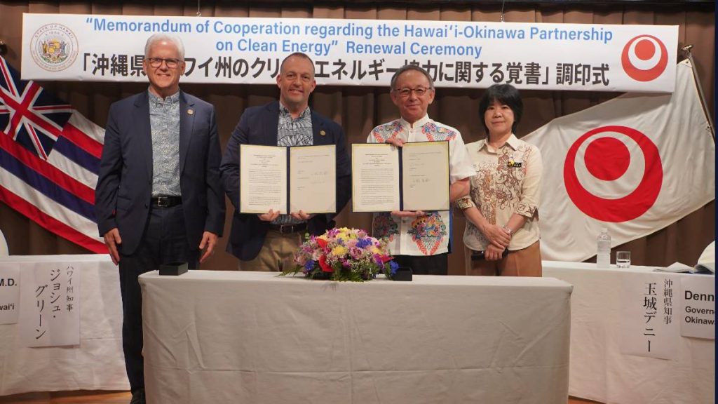 In Okinawa, Green and Okinawa Gov. Denny Tamaki signed a Five-Year Memorandum of Cooperation on Clean Energy, renewing a partnership that began in 2010 between the Hawai‘i State Energy Office and the Okinawa Prefectural Government. The agreement advances shared goals for renewable energy, clean transportation and grid innovation across island communities.