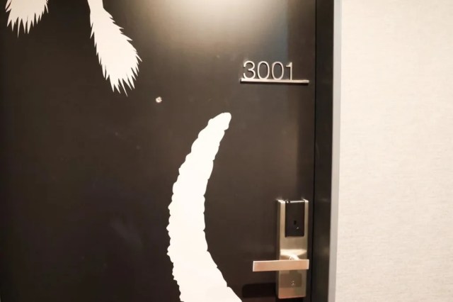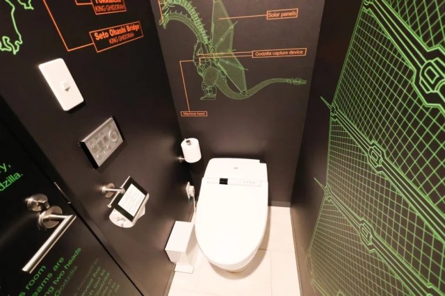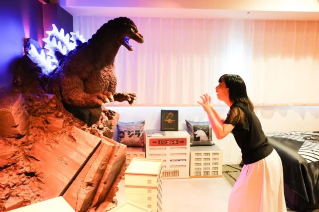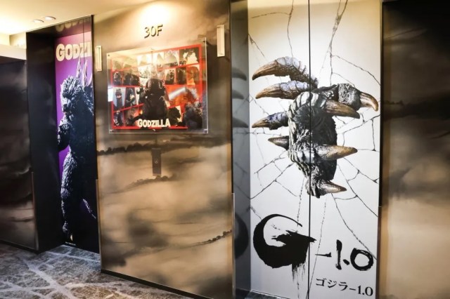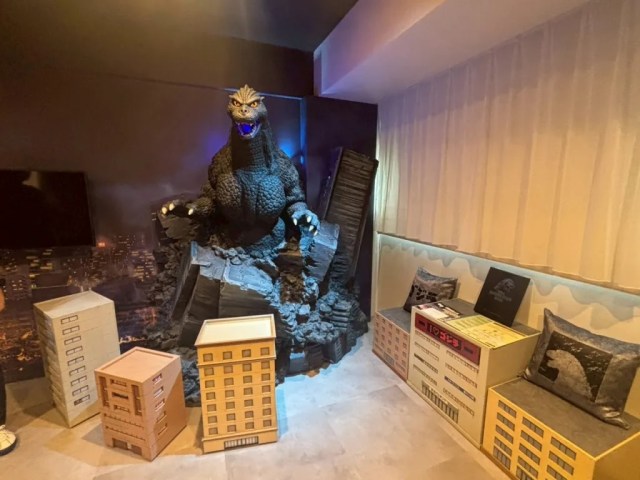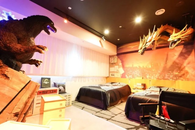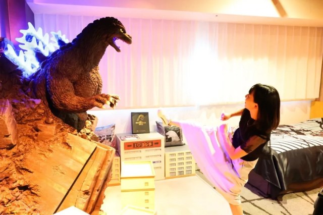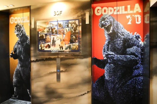 The room is located on the 30th floor, the top floor of the hotel, where all of the elevator doors feature Godzilla artwork.