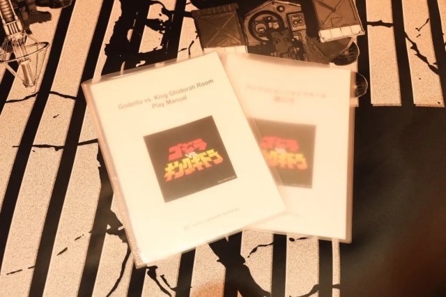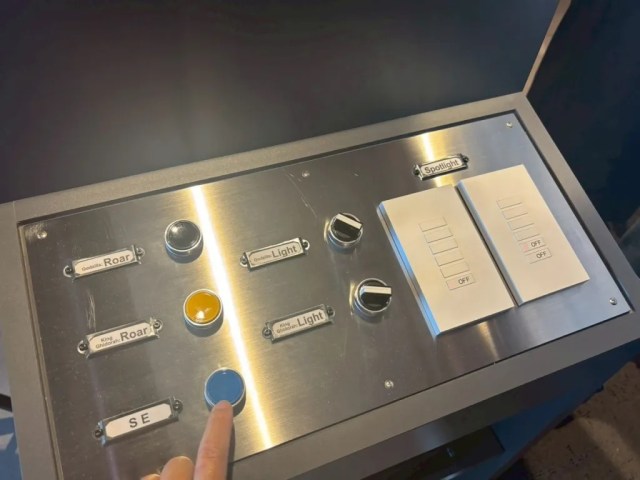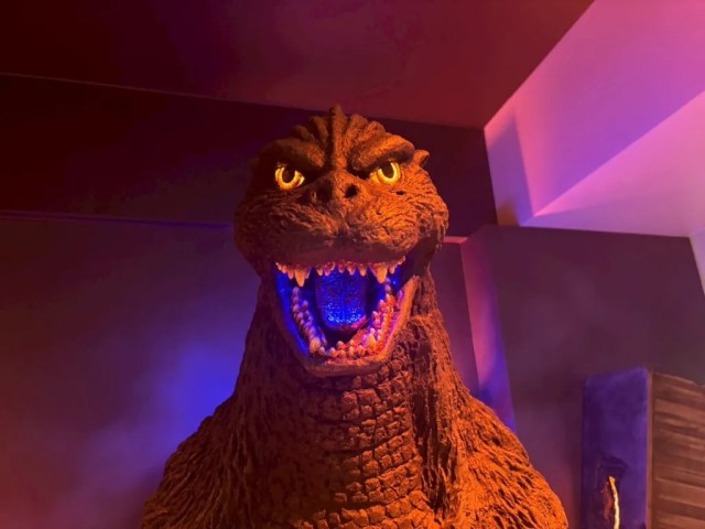 To help you get in the mood and snap the perfect picture, the room includes a control panel with buttons you can press to play sounds of Godzilla and Ghidorah roaring or to add extra illumination to them.