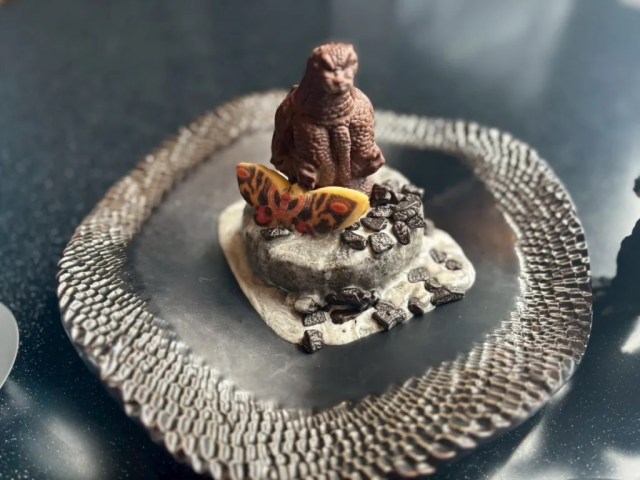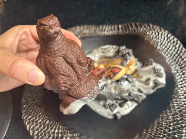 This edible throw-down features a chocolate Godzilla and Mothra atop a thick, black sesame-flavored pancake. The detail on the Godzilla is really impressive, and the chocolate has a surprising amount of weight to it too.