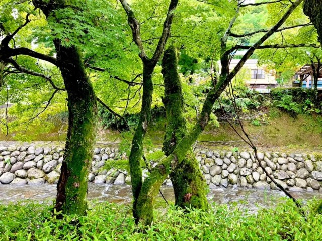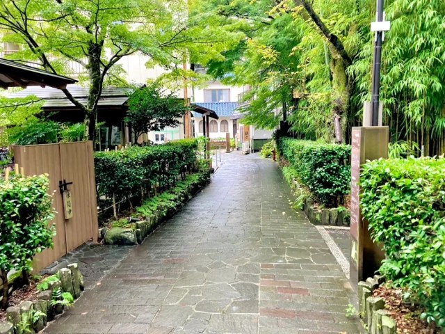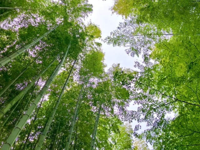 This beautiful pathway through a bamboo grove even has a circular bench in the middle, where you can sit down, tilt your head back and look up at the greenery, and bathe in the sounds of the nearby river as you rest your soles and soul.