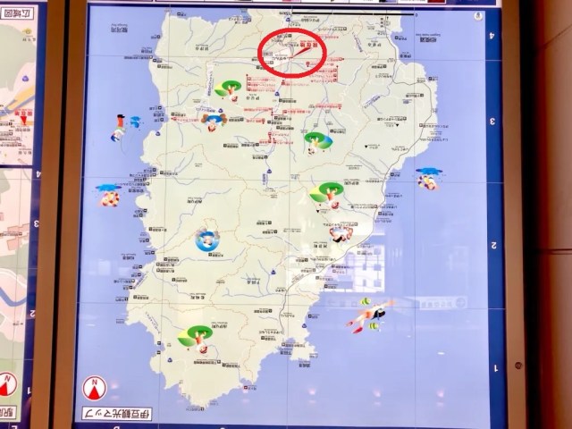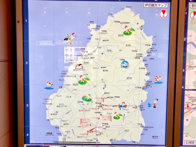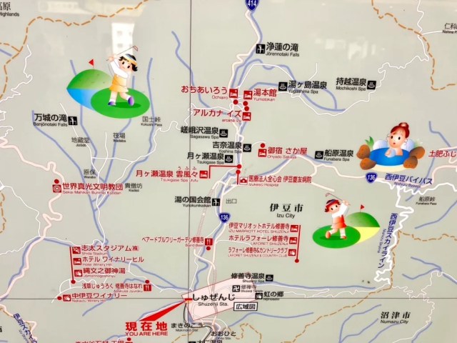 Shuzenji is in the north part of the Izu Peninsula. The map below, which we snapped a photo of at the station, is a little confusing because it’s drawn with south at the top instead of north, since it’s oriented in the direction you’re facing while looking at it (i.e. because of where it’s placed in the station, as you look at the map you’re physically facing south).