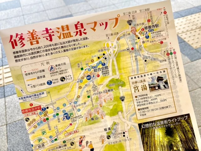 We ended up in Shuzenji based on the recommendation of a friend of our Japanese-language reporter Udonko’s, but arrived with no other advance information besides that it’s a sho-Kyoto worth checking out. Looking at the map, we spotted a number of onsen/hot spring baths in the town, marked with the kanji characters 温泉.