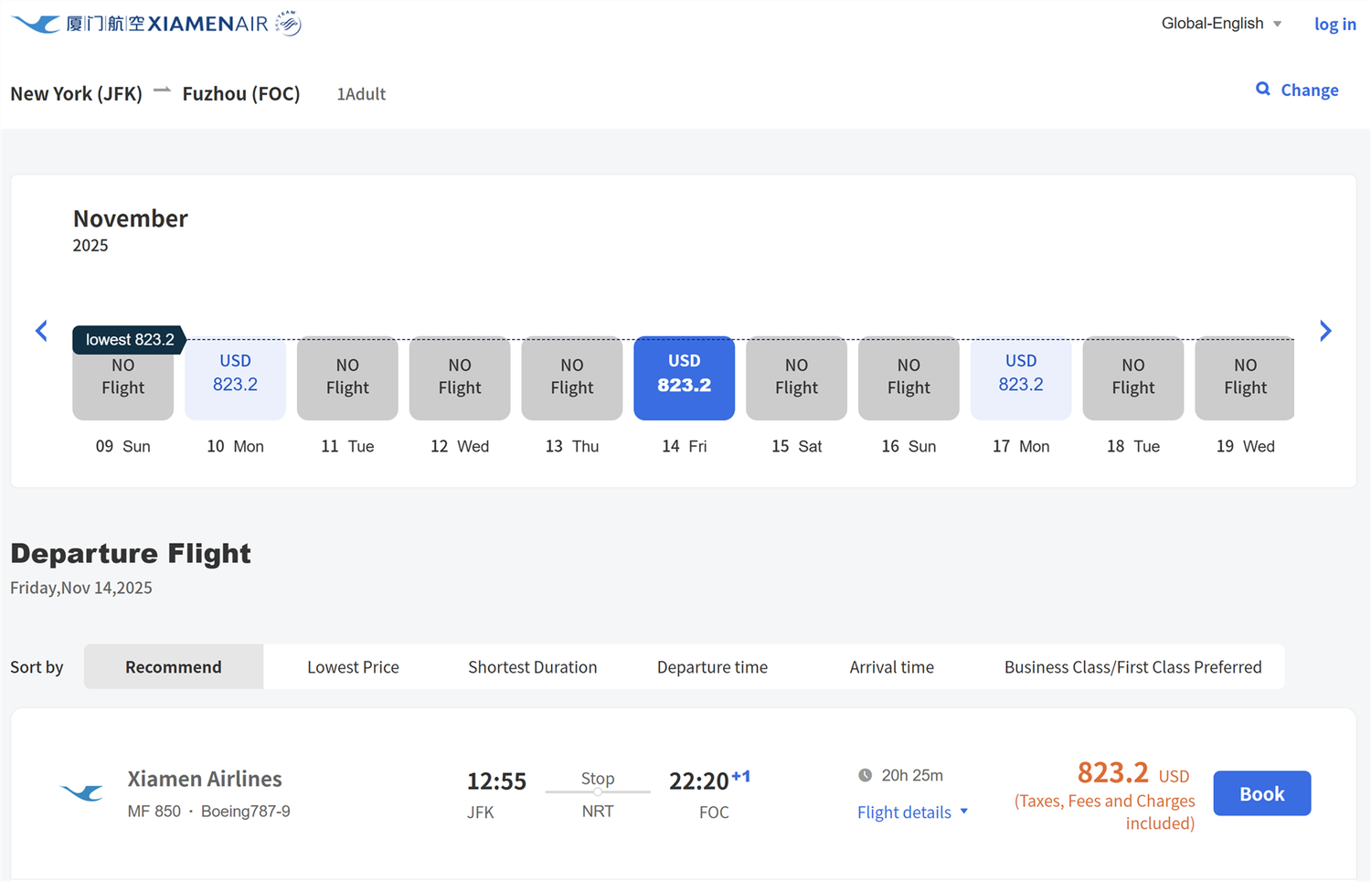 Xiamen Airlines in the last 24 hours filed service changes to its Fuzhou – New York JFK service in various sales channels, for travel between 20OCT25 and 28MAR26. The new adjustment as of 14OCT25 now shows the airline operating westbound service via Tokyo Narita as technical stop from 20OCT25. This was previously reported on AeroRoutes on 09OCT25, citing the carrier’s document submission to the US DoT.