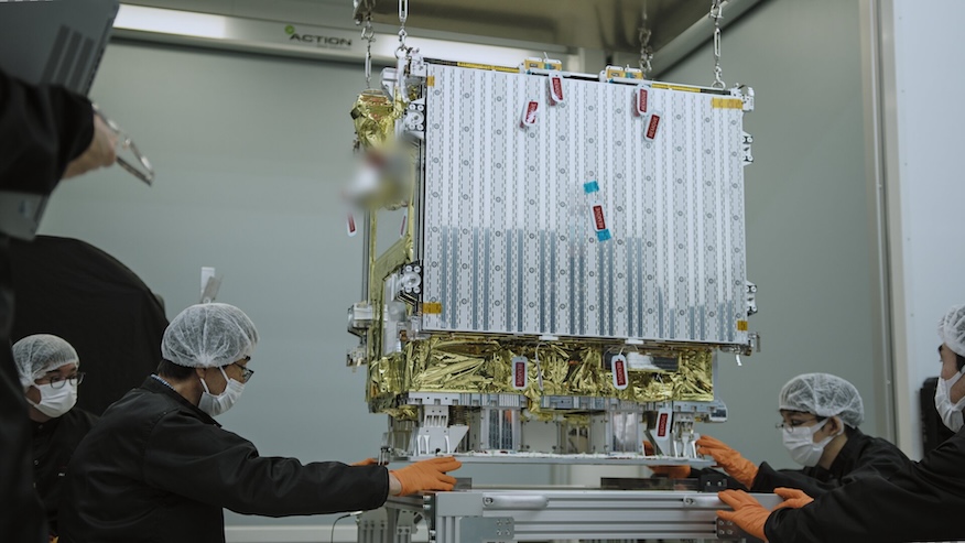 A StriX-series synthetic aperture radar satellite from Japan-based Earth observation company, Synspective, is processed in a clean room prior to launch on a Rocket Lab Electron rocket during the ‘Owl New World’ mission. Image: Rocket Lab