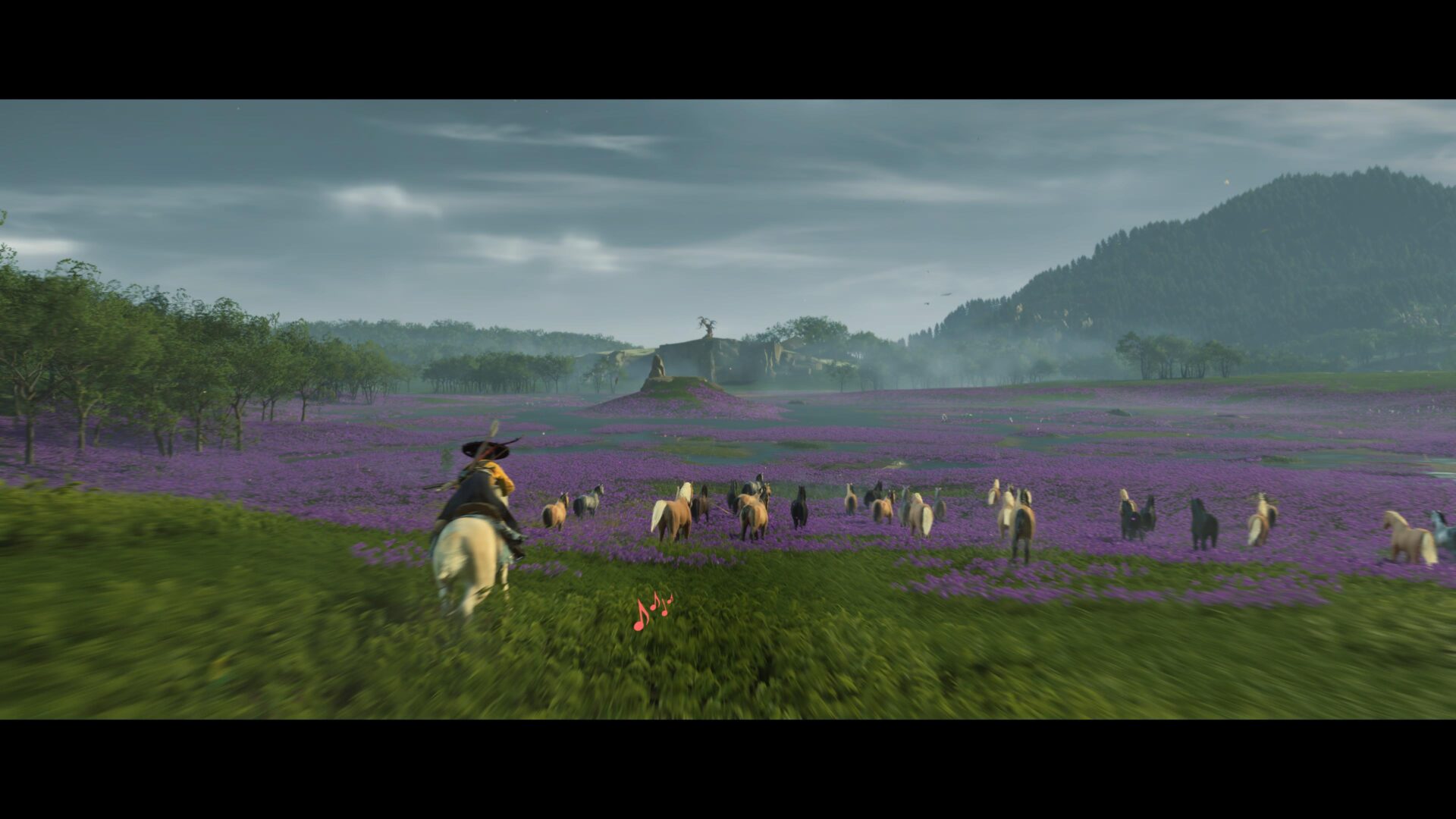 Riding in fields of lavender with wild horses is an indescribably beautiful experience in Ghost of Yōtei. SCREENSHOT: Yap Hui Bin