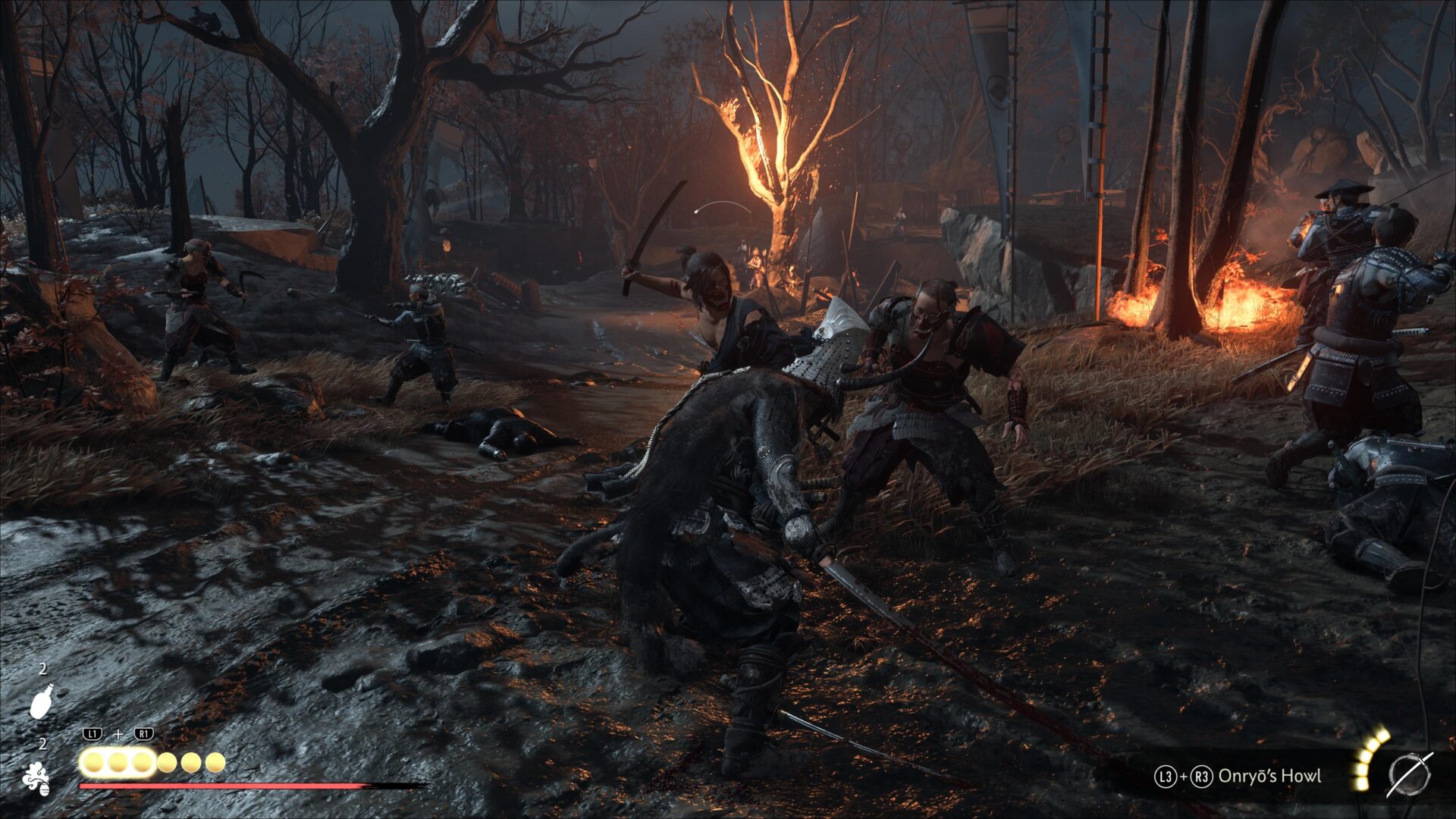 Combat in Ghost of Yōtei requires constantly switching weapons and using a variety of tools to defeat enemy hordes. SCREENSHOT: Yap Hui Bin