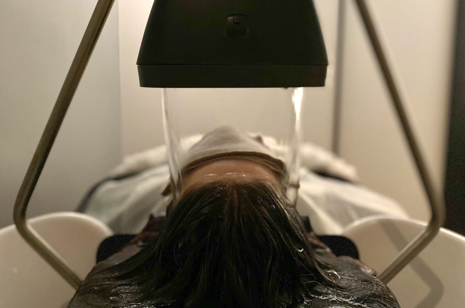 Kokage’s most popular treatment is the 90-minute “Head Soaking Improvement Care Course.” Along with a variety of hair treatments, this course also includes head massages that will leave you feeling warm for hours — much like the lingering effect of a sauna. Midway through the treatment, the specialist will activate the “onsen experience.” As seen in the image above, a soft, warm flow of water cascades down onto your head, leaving you in a state of pure bliss. Paired with the relaxing rainforest background music, it feels like you are leaning back and letting your head soak in a warm, rippling creek.