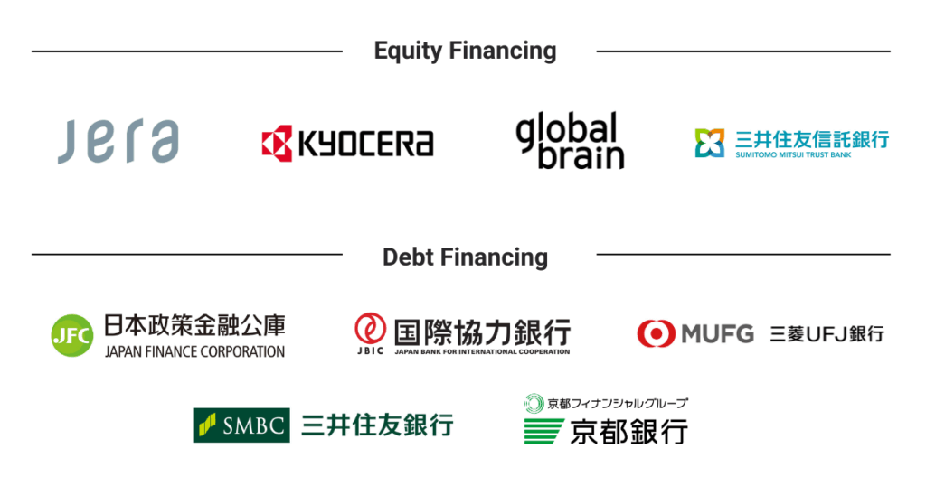 This latest round includes ¥1.45 billion in equity financing, with participation from four new investors, notably Kyocera Venture Innovation Fund-I (KVIF-I Limited Partnership, General Partner: Global Brain Corporation), JERA Co, Inc, and Sumitomo Mitsui Trust Bank, Limited.