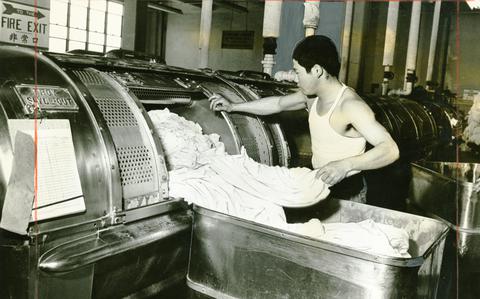 Machinato, Okinawa, April 1958: Shosei Itokazu, a local Okinawan employee of the U.S. Army Quartermaster Group Laundry and Dry Cleaning Branch at Machinato on Okinawa, removes sheets from one of the 16 washers at the branch laundry. The washer can clean 225 sheets in 45 minutes.