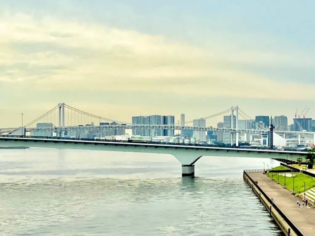 …and we can also take in the view of the Rainbow Bridge, which connects central Tokyo with the Odaiba neighborhood, which is also on an island in Tokyo Bay.