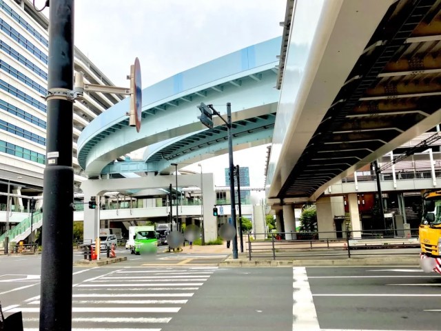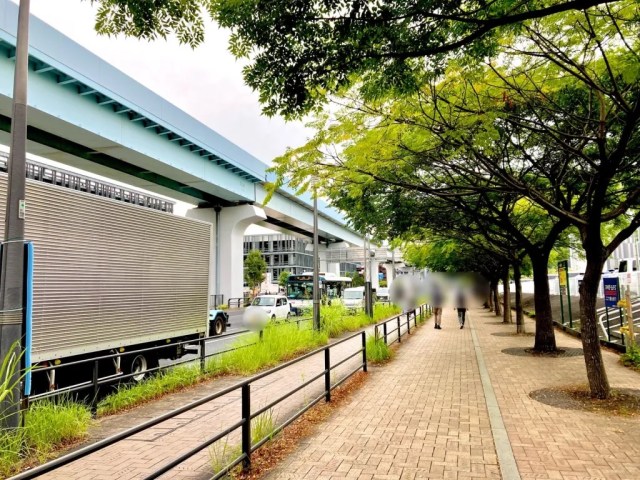 Now it’s time to get off Route 304, as we hang a right and walk along the sidewalk that parallels the elevated Yurikamome Line. At the next intersection we’ll come to Shijomae Station, the closest stop to the Toyosu fish market that replaced Tsukiji’s, and here we turn left.