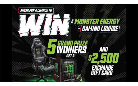 Five grand-prize winners will each receive a Monster Energy gaming chair, Monster Xbox One controller, Monster gaming headset, and a Monster cooler along with a $2,500 Exchange gift card. Each grand prize is valued at $3,369.50.