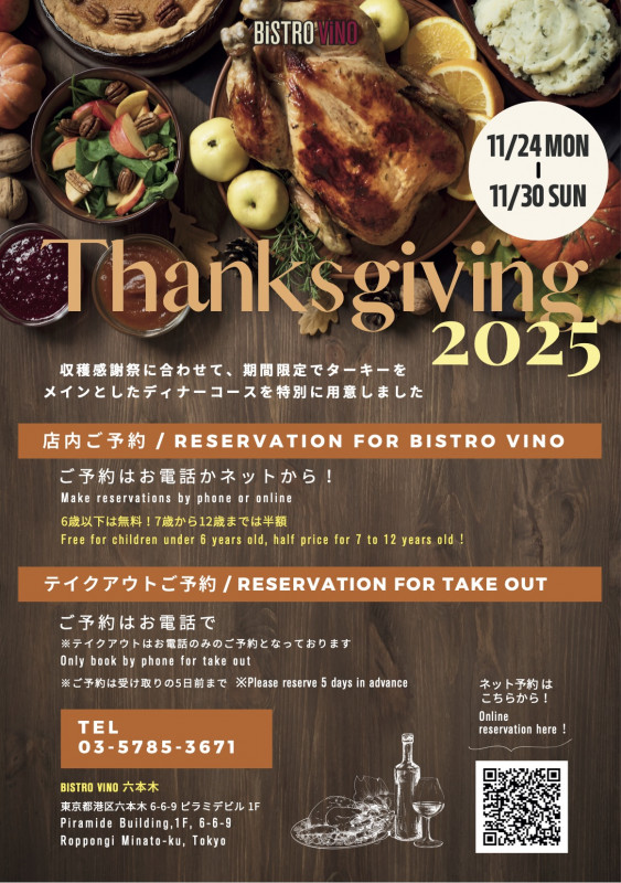 As the cool autumn breeze sweeps through the city, the season of Thanksgiving in Tokyo draws near once again. Roppongi’s sophisticated Bistro Vino is set to host its highly anticipated Thanksgiving feast from November 24 to November 30, 2025. For a comforting blend of tradition and modern culinary flair, book a table with loved ones for this year’s celebration.