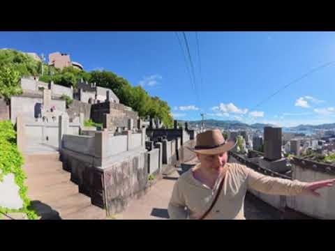 Hello. Hello. This is 360° videos and you will might be want to set your video quality to the maximum level to enjoy the video and you can rotate your device to take a ground. So, we are on the top near the top of the hill of Nagasaki city. It’s a city center down below in front of me. And I am actually staying in the middle of the cemetery that uh you know created on top like on the top of the hill. So there is a graves everywhere here on top and on the bottom. Still in front of me you can see a bridge Nagasaki beach and on the right side there is hills with hotels and there is like four stars hotels there and the observation desk also on the top of that hill on the left side it’s another living hill let’s say more like residential area and in front of us is a bay of Nagasaki as you can see it’s a pretty modern uh city with a lot of apartment buildings. What appears to be radiation levels is low here. It’s the lowest I measured anywhere in the world. So in the city center it’s like uh 003 micro zero. Um like in Europe usually have 012 you know in Italy on the beaches beach side like C sideite you have 006 uh I didn’t expect that let’s say so as you can see after was in 1945 like 55 years and 25 like 60 80 years in 80 cares you have zero radiation resilience in the area. Maybe it’s not so big a problem after here is a Buddhist stat, but you can see it from the streets. You basically should know that there is a shrine is a boat on top of it. If you will go, you know how tourists go down below the streets. You never know there is stuff. So let’s walk around the little you can see lights street lights here in Nagasaki is a very very very very giving very low light let’s say so in the middle of the night the city became dark and even the streets with the cars on the slopes very So if you’re driving a car, you might want at least for the first day uh be at your hotel before the dark cames. Otherwise it will be not very pleasant experience driving up the hill uh with uh your lights car lights only giving you uh you know the idea where you’re going and you should know that people going on the let’s say edges of the road here and you might expect that there might be a person even you have this guard rails and everything like it’s road for cars. There might be a person walking. So be careful. So in front of me this shiny thing, it’s a railway station of Nagasaki. And you also can see this huge building on the left of the railway station. It’s a hotel. And closer to me, grave is a brown town. And uh let’s say left from it there is like a tent, white tent. And then there is like a plaza building. It’s like yellowish. It’s a big uh uh shopping malls, biggest shopping malls in Nagasaki. Yes. And as you can see, you can have a residential building on top of the hill easily. You even can have residential building in the middle of the cemetery. I think we’re totally fine here. Like you see these buildings for example on the left and this is working cemetery. Uh basically people still uh creating buring their relatives here and creating fresh boring places. a little uphill residential in the YouTube channel. As you can see that they even has a trash cans, trash box here. So, someone took the trash and move it somewhere by hands maybe. It’s hot. Sometime you have very very narrow buildings. It’s usual in Japan. They were built when you have no way around and they still there after centuries. Here is a drainage that comes from the hill. There was no rain. No, but still some water going down below and you can see there is a vending machines and it’s really cool. So you have quite machines everywhere because in such a day I want to drink. This house is on top of the you know road just create some space. This is the road down below to the city center. As you can see, there is even parking created. Yeah. So, that’s it. Have a good day. Bye.
