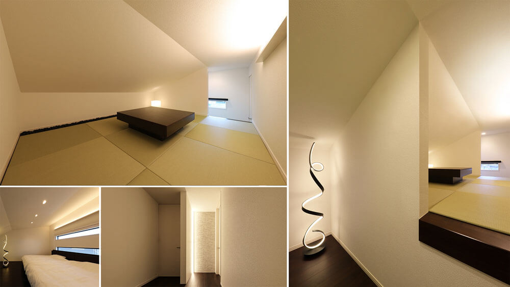 The first floor is mainly a large space consisted of living, dining, and kitchen space which is linked to courtyard-style terrace. On the second floor, there are three children’s rooms and a guest room. The guest room is a room with split levels and the upper level space has a tatami-matted floor with refined Japanese modern interior details. The most private area in the house, the master bedroom is placed on the third floor. By making use of the sloped ceiling, its construction of space offers an expressive interior.