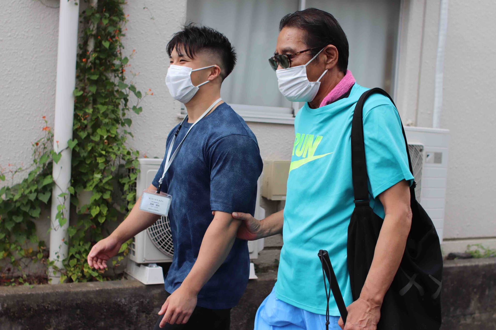 Miyazaki (left) walking with a blind patient (right). Photo courtesy of Visionary Co., Ltd.