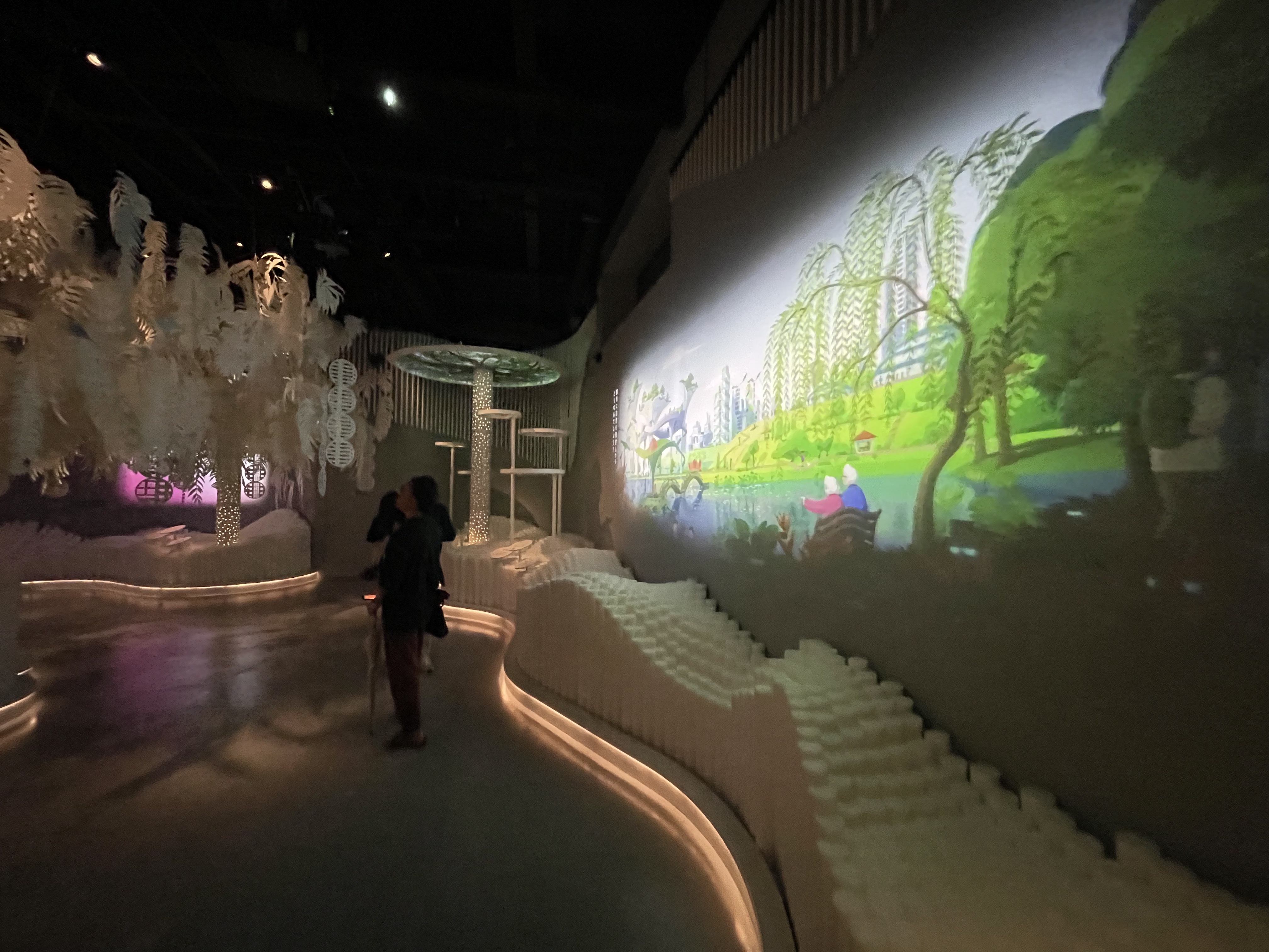 Following a spiral walkway, we reach the peak of the Dream Sphere, where all the dreams that we’ve contributed have been gathered, and are all coming together to form a massive image. We catch wisps of the words and images we’ve written on the rounded screen, where we see animated figures collecting and planting these dreams. It’s a dizzying experience to look up and follow the many things happening onscreen, but suffice to say, these dream ‘seeds’ mature quickly into trees, filling all the blank spaces and blooming into the city of the future before our very eyes, as birds and animals come to roost and make their home, whether in the forests of aquascapes. We see heritage housing, well-preserved even in the future, and towering supertrees – this is truly the city of the future.