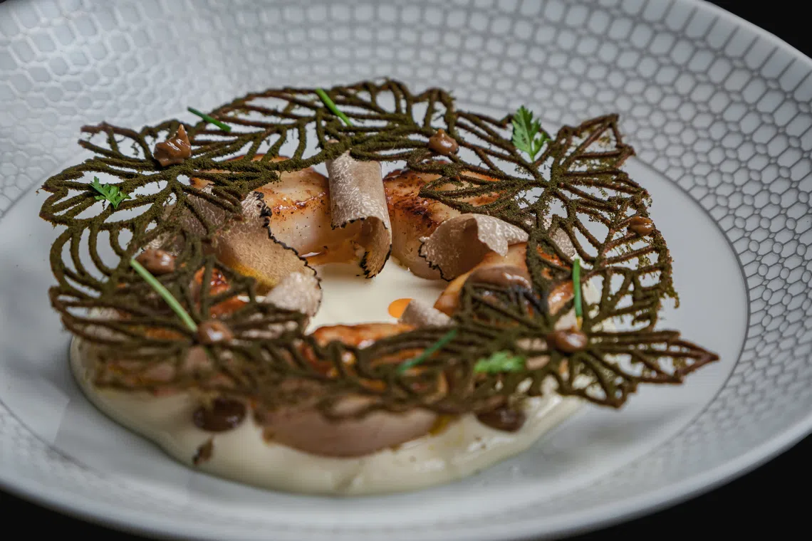 Cherry Garden's modern Chinois interiors. Hokkaido scallops and bacon in leek veloute. PHOTO: 54⁰ STEAKHOUSE