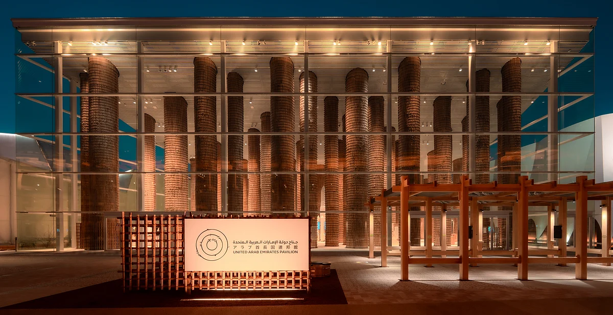 The pavilion featured 90 palm frond columns that combined Emirati identity and sustainable innovation, with a focus on three main themes: space, sustainability, and healthcare.